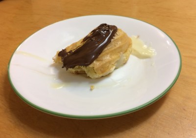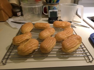 Since it was getting late and we wanted to actually eat the eclairs that day, we just smeared Nutella on top rather than mess around with chocolate ganache or some other interesting topping. I should have taken the photo before biting into mine.