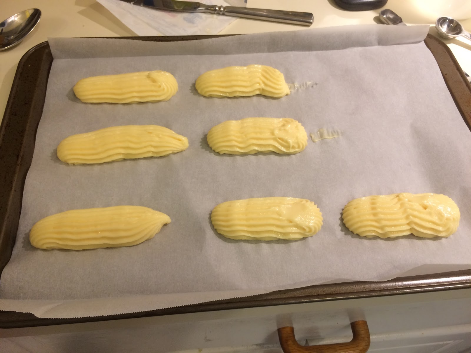 On my last trip to Michael’s, I got a 6B piping tip and some 16″ disposable piping bags. I was think about cookies more than eclairs, and possibly I should have gotten an even larger tip. Again, I had to get my husband’s help as the dough was stiff to pipe. I would have gotten a round tip, but they didn’t have one in that size, so I ended up with interestingly ridged eclairs.