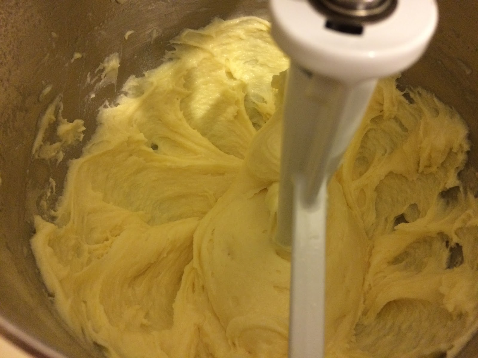 Once you reach playdough (or something thick and well-combined), the stuff goes in the standing mixer for yet more beating. First a bit just to cool it off slightly, then with the eggs, one at a time. The recipe notes that “the dough will look like it breaks apart, but keep mixing it until it comes back together again.”