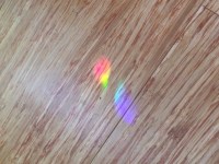 A glass ornament hung on a ribbon or plastic line isn’t going to stay perfectly still, and so the rainbows drift, lazily, around the room. If I nudge the prism, the rainbows jitter madly about for a moment, then race across the room, gradually slowing to near-stillness.