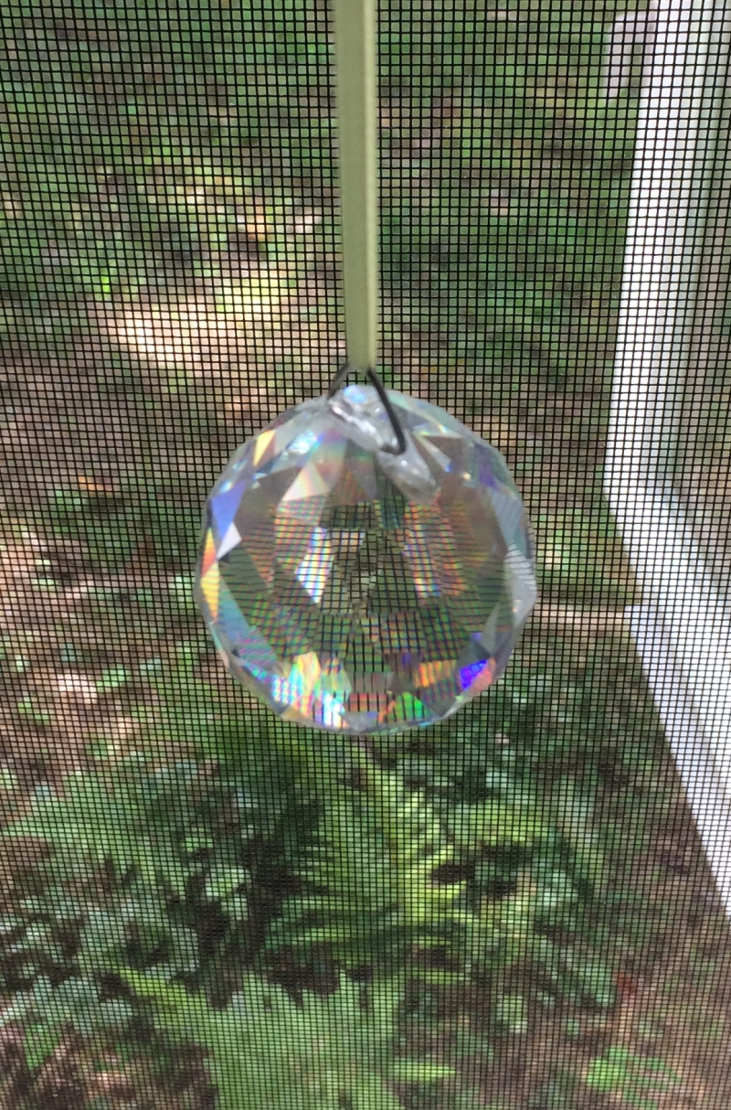 The whole idea of rainbows brings out my whimsical side. Years ago, I lived in an apartment where I hung a suncatcher in the kitchen window. Mornings, I held my cereal bowl out so I could pretend I was flavoring my breakfast with rainbow. I still like the idea of rainbow-flavored cereal.On the practical side of things, there are some difficulties in hanging chunky glass crystals (the best kind for rainbows) in a window. As I mentioned, they can swing if accidentally bumped into, and while I don’t know who would win in a contest between crystal glass and window glass, I’m sure it wouldn’t be good for either. A suncatcher on a shorter cord would be less likely to swing into the window, but it would also catch the sun less often. So most of my suncatchers hang in windows that have interior screens. The crystals would look better in windows without screens, but the screens provide extra safety for the windows.