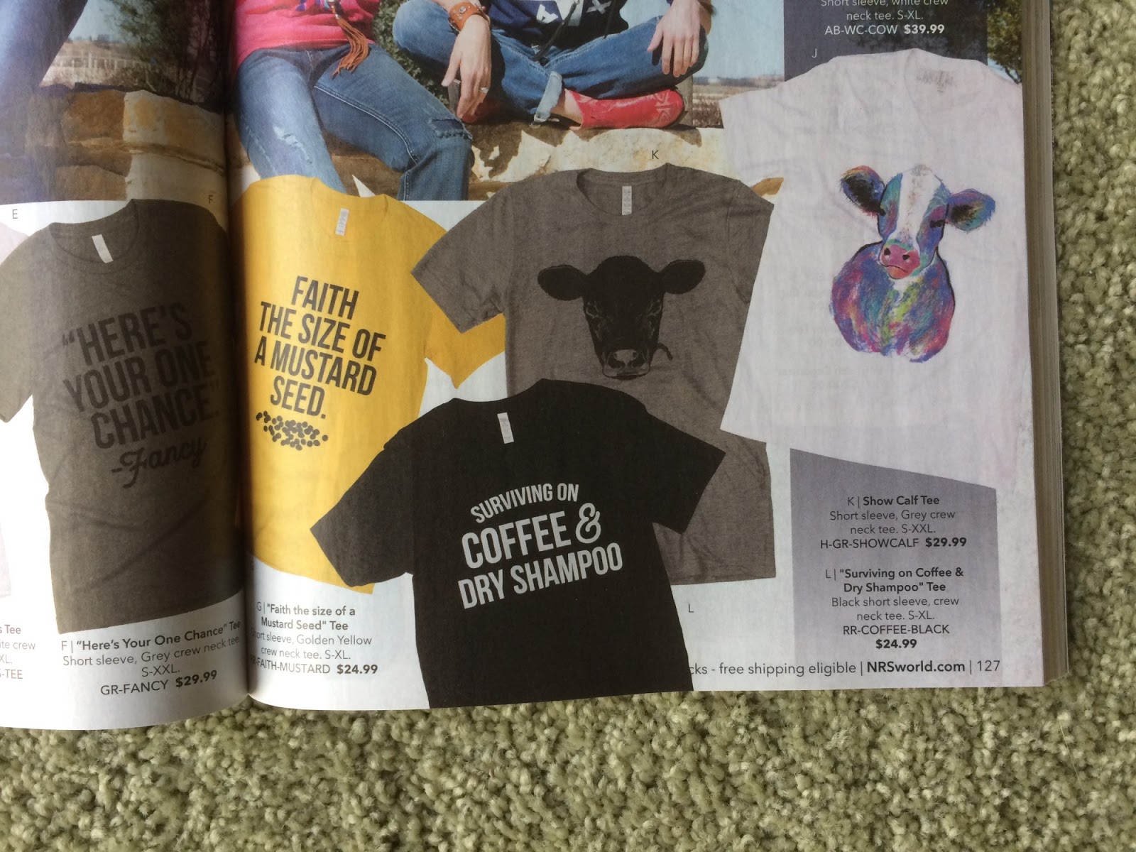 Beautiful leather belts, folding knives of many kinds, shirts, hats, and a smattering of household goods followed. Catalogs always include some t-shirts with topical pictures or sayings on them, and this was no exception. I was particularly captivated by a women’s tee that said, “Surviving on coffee and dry shampoo.” Is this a popular catchphrase? I find myself wondering if it simply means “I’m way too busy right now for regular meals, sleep, and dealing with my hair,” or whether it makes reference to people camping out at roping events with their horses and equipment. Perhaps cooked meals and showers have to wait till they get home again?