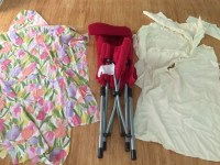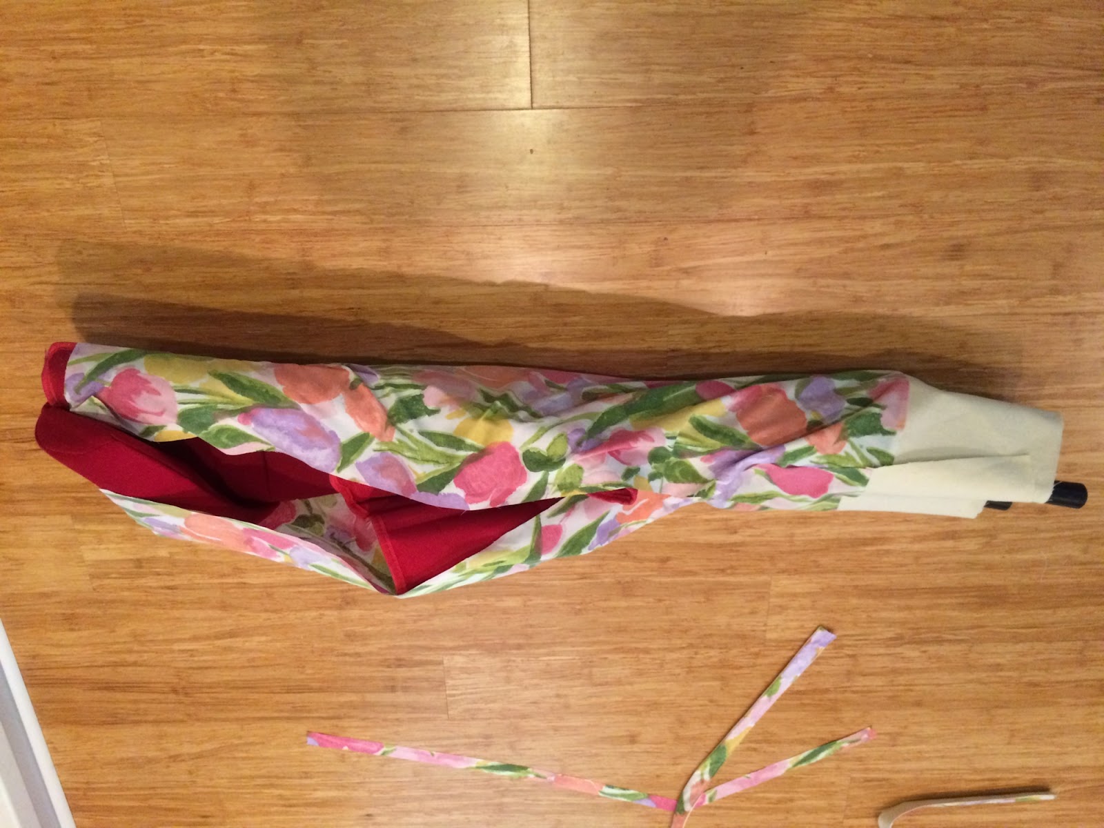 -Think more about shortcuts. I didn’t really need to sew the ties from tulip fabric. I could have used ribbon that I already have on hand and saved myself some time. I did realize (in time) that I didn’t need to put a square bottom on the bag. Unlike other folding chairs whose feet meet in a neat square, this one folds up unevenly. Just sewing the bottom of the bag straight across was sufficient.