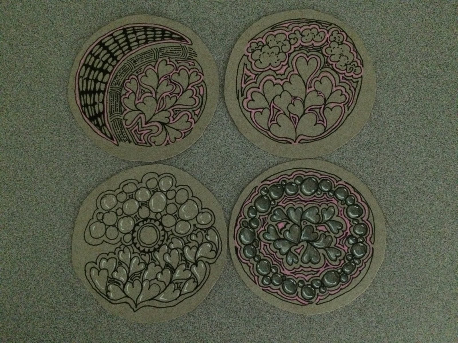 I didn’t do all that much with the auras, but since I don’t usually include auras at all, it was a change. I’m still messing around with black ink, black and white colored pencils, white gel pen, and circles cut from a cereal box. I also recently bought a pink opaque gel pen, which you see in three of the above.