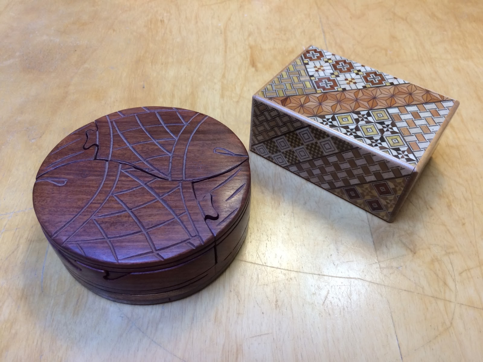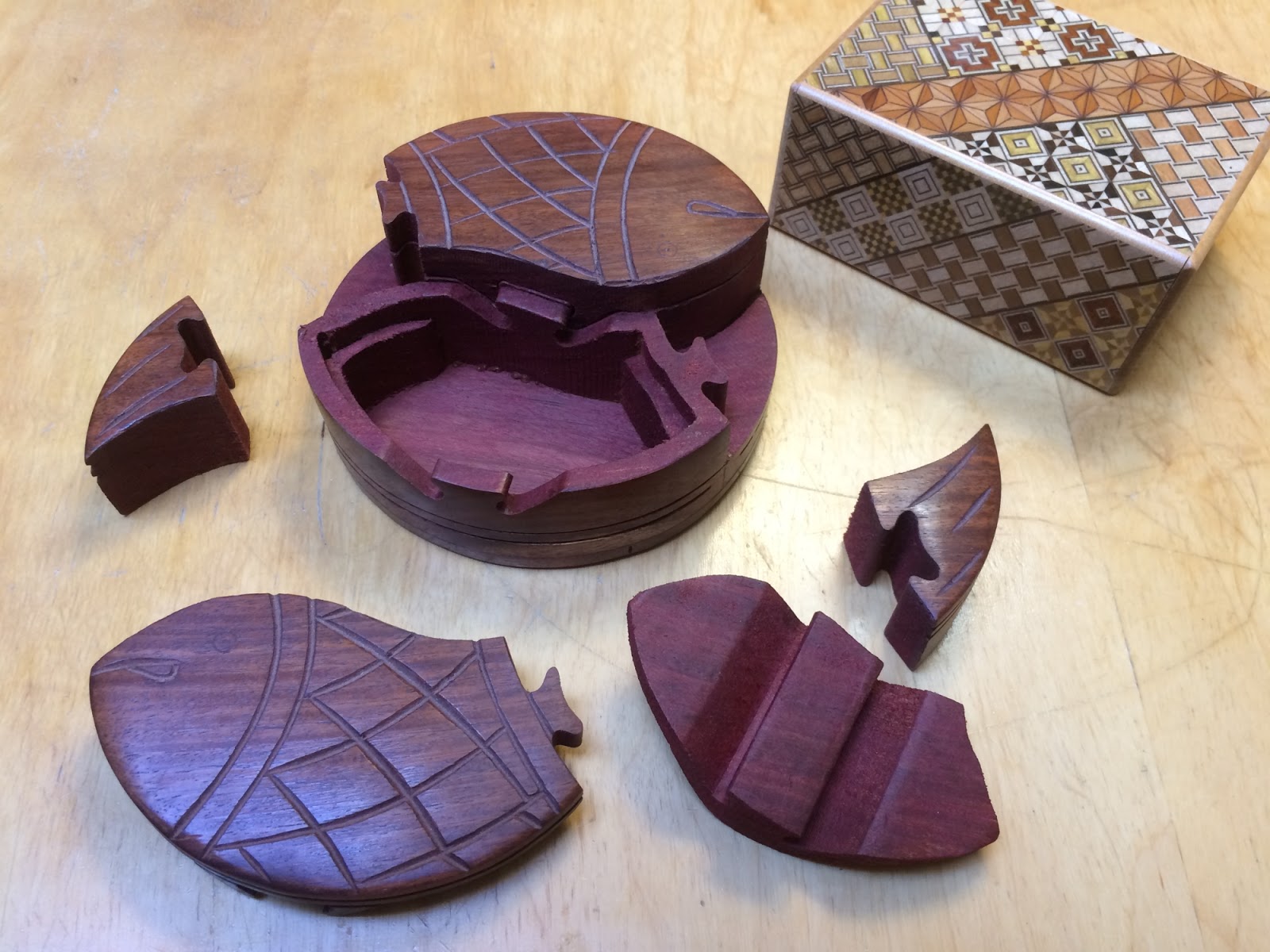 The other box is a Japanese puzzle box. Opening this box involves sliding whole surfaces forward or back or up or down, in the right sequence. I believe it is one of the easier ones, and that is difficult enough for me.