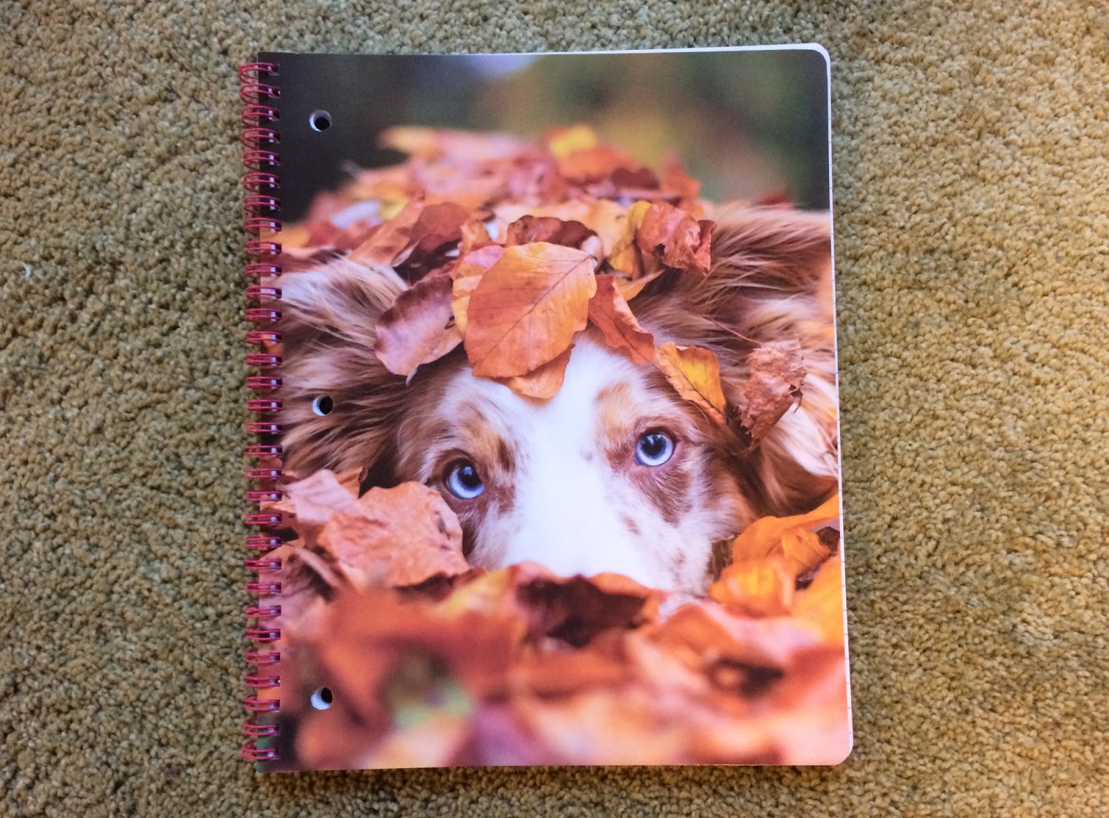 Naturally, these notes are in my new spiral notebook. I chose this year’s notebook not just because it shows a cute dog, but also because the dog is partially hidden under leaves and the story is about someone who is missing—hidden, in fact. The picture on the notebook didn’t have to go with the story—I could have just picked something because it was appealing, but I like the fact that it does relate to it.