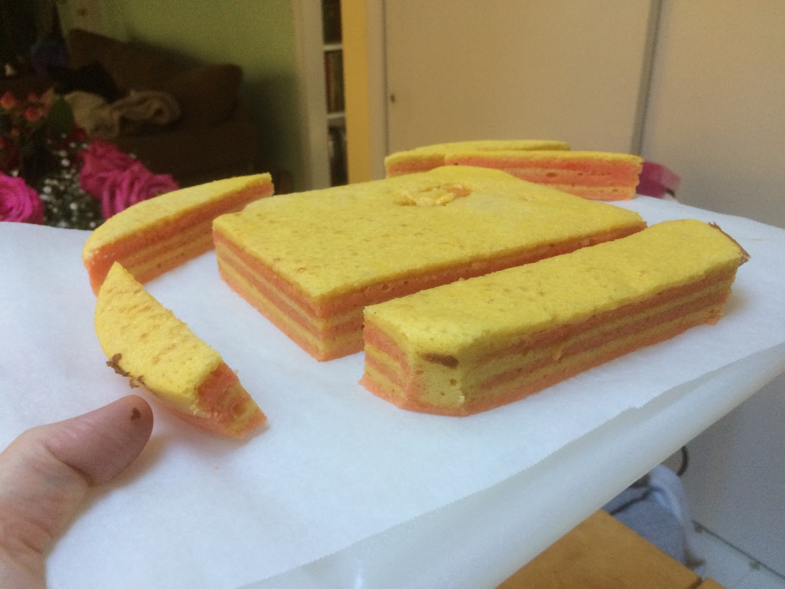 Quite a few of the recipes for sarawak kek lapis were not in English, which makes sense since it is apparently a Malaysian specialty. I did find one in English that didn’t take a dozen eggs to make–only seven. (Kek Lapis–Indonesian Layer Cake.) The layers weren’t colored and it seemed very mildly spiced, but I tried it, adding orange zest and cardamom and food coloring to make alternating layers.