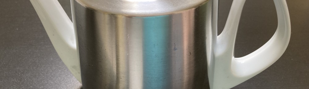 This is the teapot that traveled with my family since… I’m not sure when my parents bought it, but I’m currently sifting through family photos so possibly I will have a better answer later on. The steel part is a sort of tea cozy that fits over the plain white pot. No need to worry about the lid tipping off when you pour.
