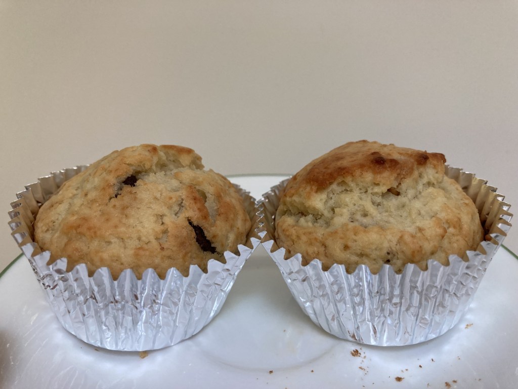 I had four overripe bananas, just enough for two batches of basic banana muffins, and some leftover peanut-butter chips in the pantry. So, in the spirit of experimentation (and because bananas and peanut butter go together so well), I made one batch with chocolate chips and the other batch with peanut-butter chips.